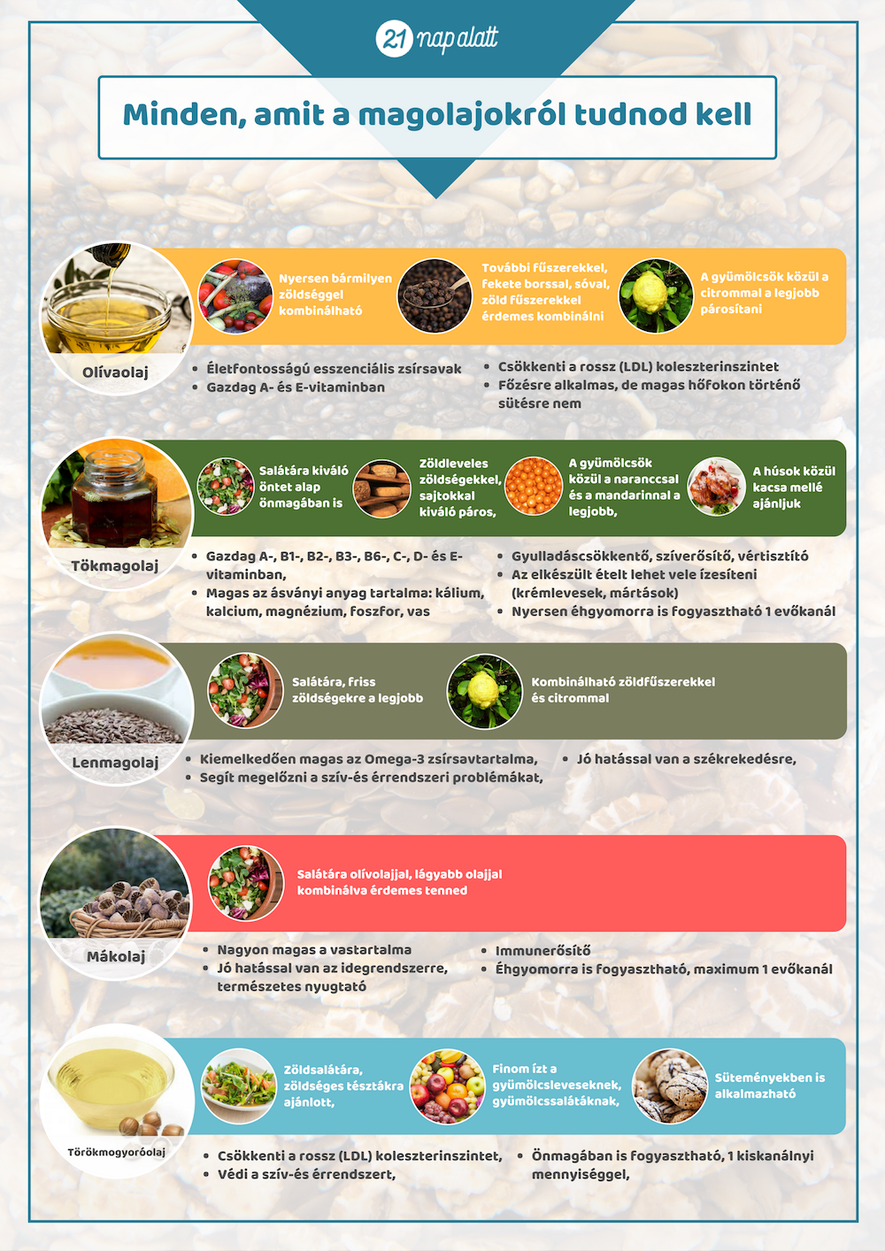 A nyár egyenlő a salátaszezonnal, a salátaszezon pedig a különböző magolajok használatával. Egyiknek másiknak semleges íze van, míg vannak olyanok is, amelyek teljesen uralják az elkészült ételeket, ezért érdemes velük óvatosan bánni. Ahhoz, hogy te is könnyedén eligazodj a magolajok között készítettem egy ábrát, ami jól szemlélteti, hogy mit mivel érdemes párosítani és milyen pozitív hatásokat gyakorolnak a szervezetedre.