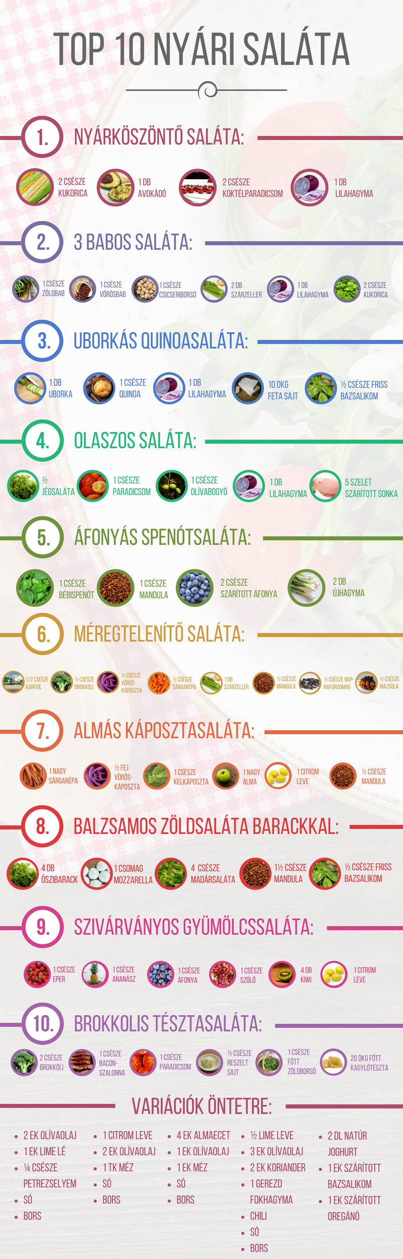 A nyári kánikulában sokszor jobb választás egy kiadós, tápláló, de mégis hűsítő saláta, mint egy nehezen emészthető szaftos húsétel. Azért, hogy ne váljon gyorsan unalmassá a legnépszerűbb nyári fogás, összeállítottam egy ábrát, amivel végig csinálhatod az egész nyarat. Használd ezt a legfinomabb nyári saláták elkészítéséhez!